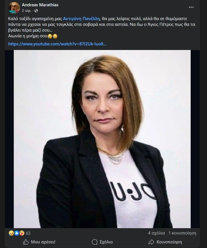 «Αποχαιρετώ, με βαθιά θλίψη, την αγαπημένη μου φίλη Αντιγόνη Πανέλλη, με την οποία γνωριζόμασταν από τα πρώτα μας βήματα στη δημοσιογραφία», γράφει ο βουλευτής της ΝΔ Γιώργος Αμυράς.