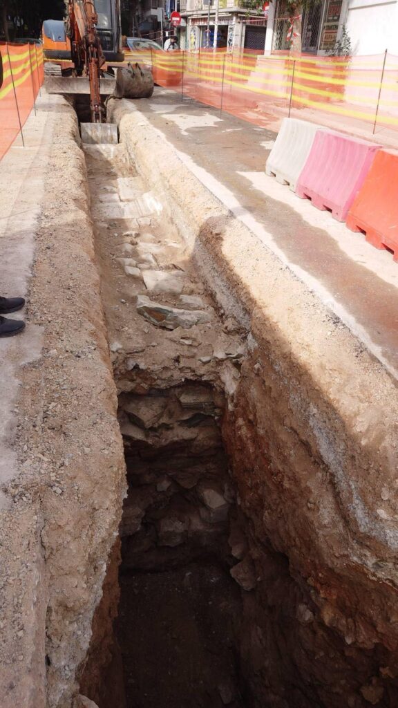 Τα συνεργεία της ΕΥΑΘ πραγματοποιούν έργα στο σημείο για την αποχέτευση και μετά την ανακάλυψη του τείχους οι εργασίες διεκόπησαν.