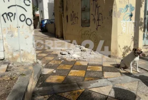 Ζημιές σημειώθηκαν και σε σπίτι στην οδό Αυλώνος, όπου σοβάδες από ένα εμφανώς προβληματικό μπαλκόνι έπεσαν στο πεζοδρόμιο.