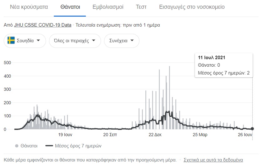Μετά από 1,5 χρόνο η Σουηδία καταγράφει ελάχιστα κρούσματα και μηδενικούς θανάτους και προφανώς το κλίμα τρομοκρατίας και βίας που υπάρχει στη χώρα μας εκεί είναι κάτι άγνωστο.