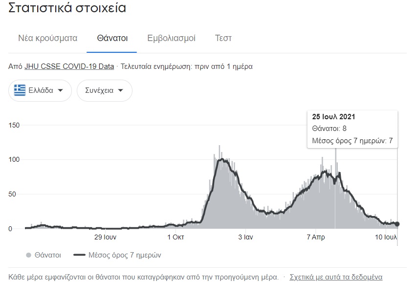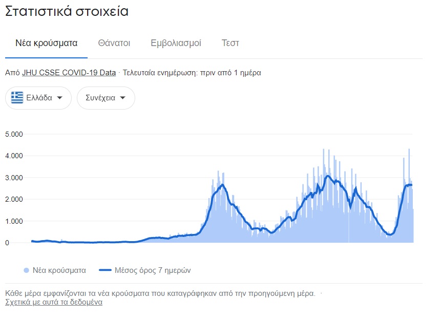 Τα παρακάτω διαγράμματα είναι αποκαλυπτικά και δείχνουν ξεκάθαρα πως τα κρούσματα το τελευταίο χρονικό διάστημα (έχουν αυξηθεί και τα τεστ) έχουν αυξηθεί ραγδαία, παρόλα αυτά ο αριθμός των θανάτων παραμένει σε χαμηλά επίπεδα.