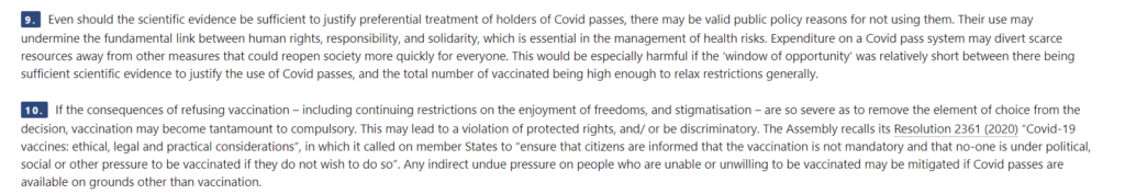 Η Συνέλευση υπενθυμίζει το ψήφισμά της 2361 (2020) «Εμβόλια Covid-19: ηθικά, νομικά και πρακτικά ζητήματα», στα οποία κάλεσε τα κράτη μέλη να «διασφαλίσουν ότι οι πολίτες ενημερώνονται ότι ο εμβολιασμός δεν είναι υποχρεωτικός και ότι κανείς δεν υπόκειται σε πολιτική, κοινωνική ή άλλη πίεση για εμβολιασμό αν δεν το επιθυμεί». Οποιαδήποτε έμμεση αδικαιολόγητη πίεση σε άτομα που δεν μπορούν ή δεν επιθυμούν να εμβολιαστούν μπορεί να μετριαστεί, εάν τα πιστοποιητικά για τον Covid19 είναι διαθέσιμα και για άλλους λόγους εκτός από τον εμβολιασμό.