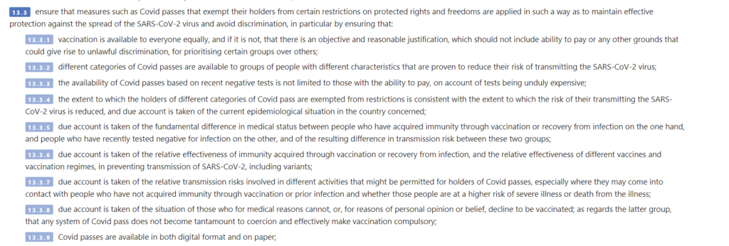 ΑΡΘΡΟ 13,3: Η Συνέλευση καλεί τα κράτη –μέλη του Συμβουλίου της Ευρώπης να διασφαλίζουν ότι μέτρα όπως το Covid pass που απαλλάσσουν τους κατόχους τους από ορισμένους περιορισμούς στα προστατευόμενα δικαιώματα και ελευθερίες εφαρμόζονται με τέτοιο τρόπο ώστε, αφενός να διατηρείται αποτελεσματική προστασία έναντι της εξάπλωσης του ιού SARS-CoV-, αφετέρου να αποφεύγονται οι διακρίσεις, ιδίως διασφαλίζοντας μεταξύ άλλων ότι λαμβάνεται δεόντως υπόψη η κατάσταση εκείνων που για ιατρικούς λόγους δεν μπορούν, ή, για λόγους προσωπικής άποψης ή πεποιθήσεων, αρνούνται να εμβολιαστούν. Όσον αφορά στην τελευταία ομάδα, (σ.σ. τα κράτη μέλη) πρέπει να διασφαλίζουν ότι οποιοδήποτε σύστημα Covidpass δεν ισοδυναμεί με εξαναγκασμό που καθιστά υποχρεωτικό τον εμβολιασμό.