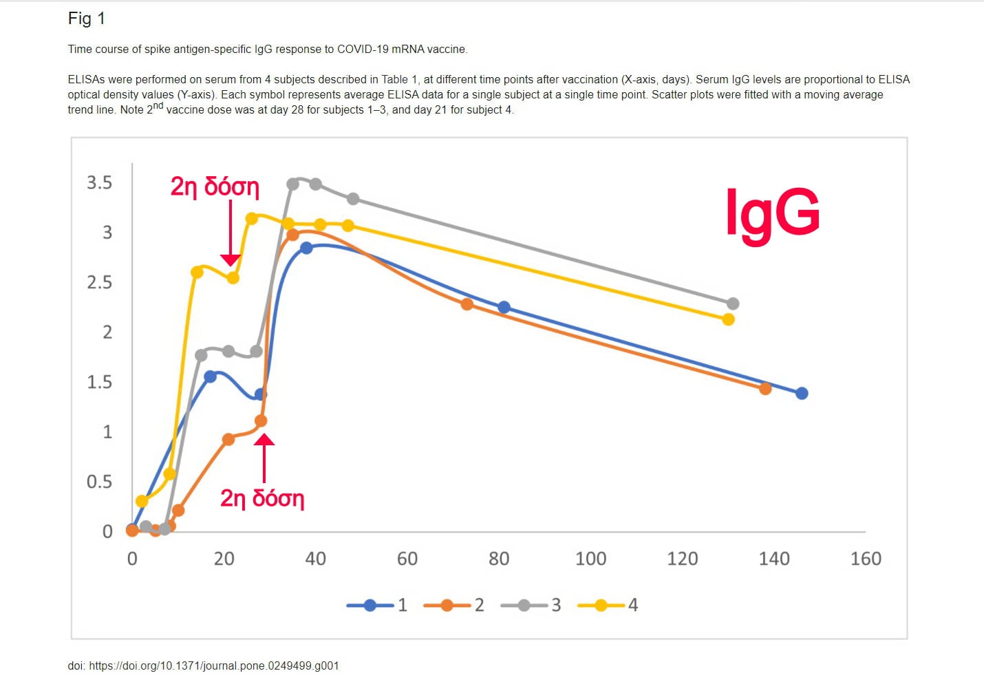 Στους τρεις εξεταζόμενους, η 2η δόση χορηγήθηκε την 28η μέρα μετά την πρώτη δόση, ενώ στον τέταρτο χορηγήθηκε την 21η μέρα μετά την πρώτη δόση.