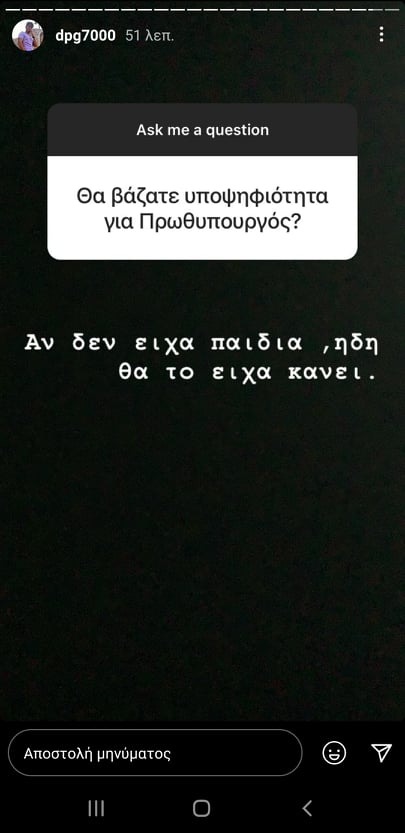 Σε ερώτηση που δέχθηκε για το εάν θα έβαζε υποψηφιότητα για πρωθυπουργός ο Δ.Γιαννακόπουλος απάντησε: «Εάν δεν είχα παιδιά θα το είχα κάνει ήδη».