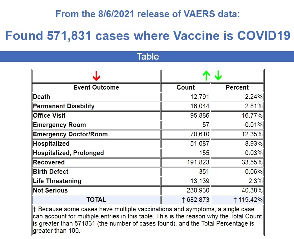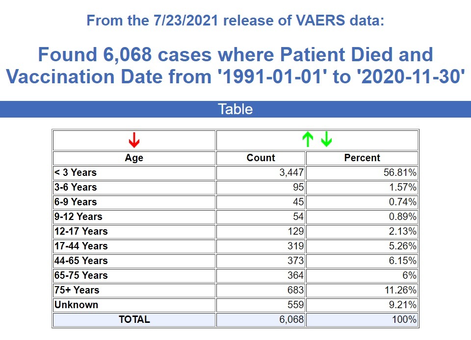 Σύμφωνα με τα τελευταία στοιχεία του CDC, τα οποία δόθηκαν στη δημοσιότητα την Κυριακή 14 Αυγούστου και αφορούν τις καταγραφές παρενεργειών στο σύστημα VAERS, από τα εμβόλια κατά του κορωνοϊού έχουν πεθάνει στις ΗΠΑ διπλάσιοι απ’ ότι έχουν πεθάνει απ’ όλα τα εγκεκριμένα εμβόλια του FDA τα τελευταία τριάντα χρόνια.