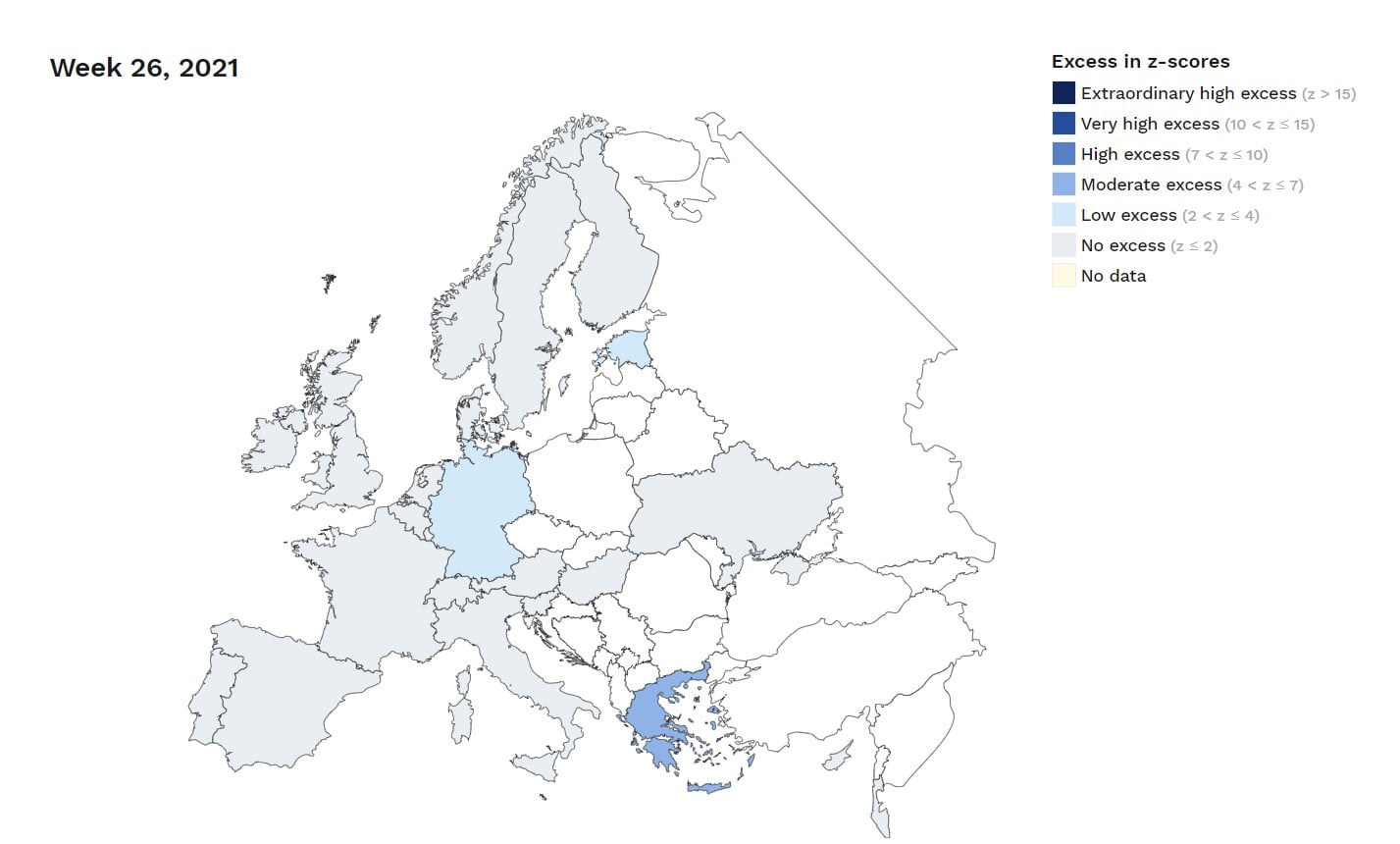 Ο πρώτος χάρτης, όπως γράφει επάνω, αφορά στην 26η βδομάδα. Το βαθύ μπλε χρώμα της Ελλάδας δείχνει την μεγάλη αύξηση θανάτων, πράγμα που δείχνει παραστατικά τα αποτελέσματα της ΕΛΣΤΑΤ, που ήδη τα ξέρουμε και τον έβαλα απλώς για σύγκριση με τον δεύτερο χάρτη.