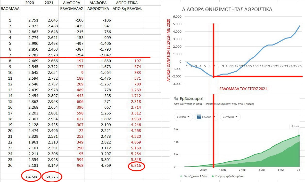 Σύμφωνα λοιπόν με τα στοιχεία της οι θάνατοι στην Ελλάδα κατά τις 26 πρώτες εβδομάδες του 2021 (4/1/2021–4/7/2021) ανήλθαν σε 69.275 (35.528 άνδρες και 33.747 γυναίκες) ενώ κατά τις αντίστοιχες 26 εβδομάδες του 2020 (30/12/2019–28/6/2020) είχαν ανέλθει σε 64.506 (32.266 άνδρες και 32.240 γυναίκες), σημειώνοντας αύξηση 7,39%.