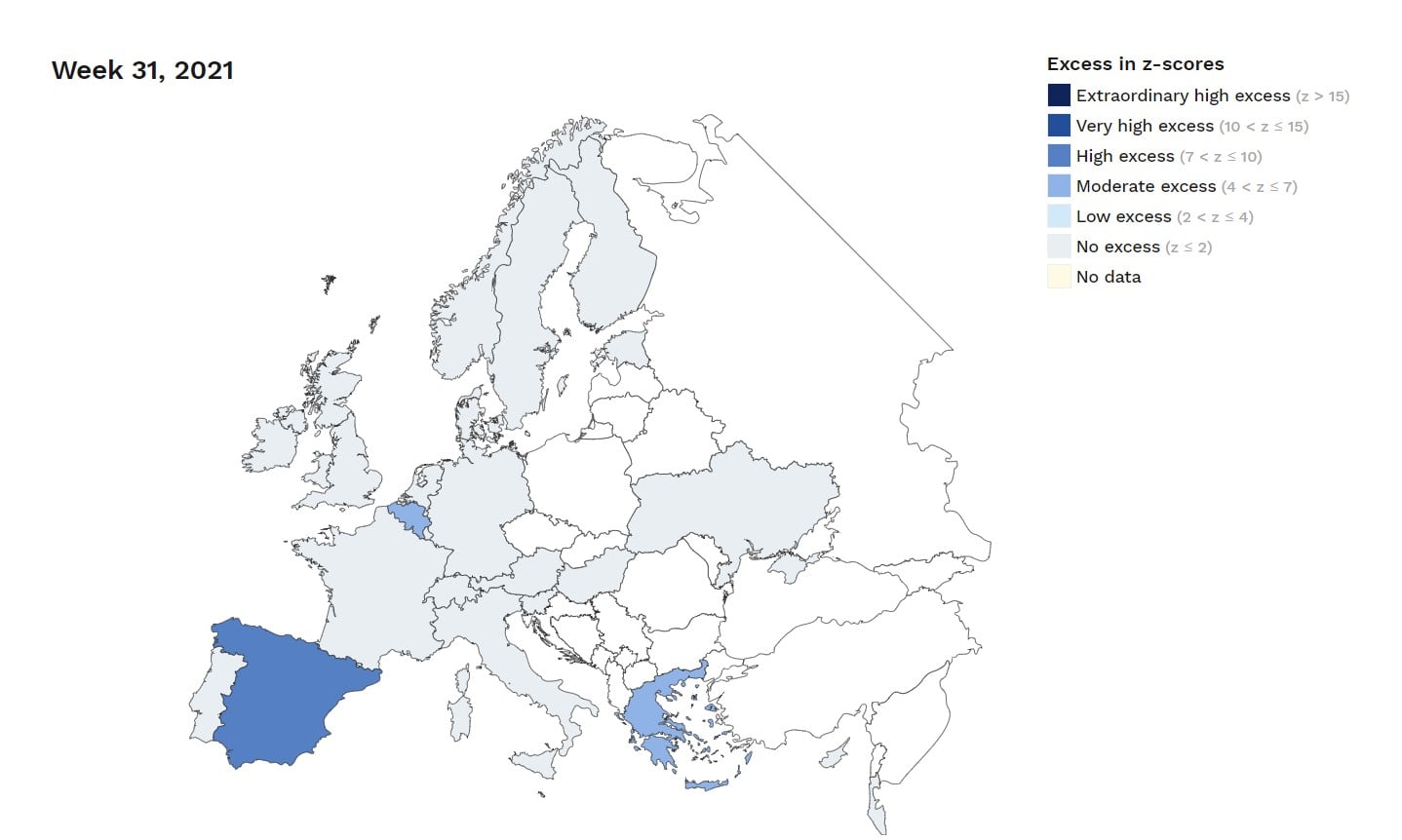Οι δύο χάρτες που ακολουθούν είναι από το EUROMOMO (European Mortality Monitoring – Ευρωπαϊκή Παρακολούθηση Θνησιμότητας).
