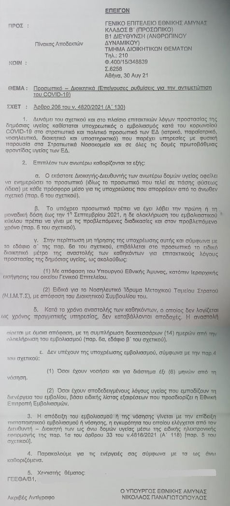 «Δυνάμει του σχετικού και στο πλαίσιο επιτακτικών λόγων προστασίας της δημόσιας υγείας καθίσταται υποχρεωτικός ο εμβολιασμός κατά του κορωνοϊού COVID-19 στο στρατιωτικό και πολιτικό προσωπικό των ΕΔ (ιατρικό, παραϊατρικό, νοσηλευτικό, διοικητικό και υποστηρικτικό) που παρέχει υπηρεσίες με φυσική παρουσία στα Στρατιωτικά Νοσοκομεία και σε όλες τις δομές πρωτοβάθμιας φροντίδας υγείας των ΕΔ.