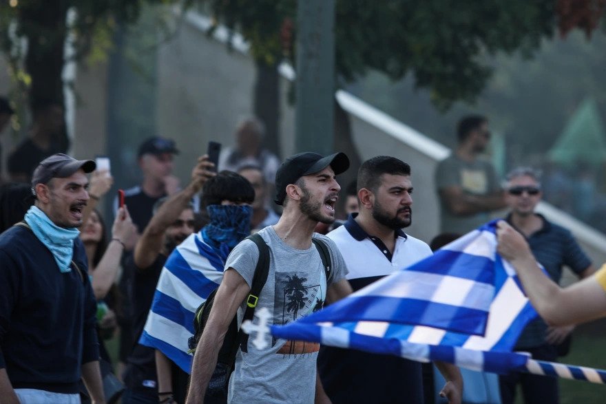 Μερίδα ατόμων άναψε πυρσούς και φωνάζει συνθήματα κατά της κυβέρνησης, του πρωθυπουργού, αλλά και κατά των δημοσιογράφων. Πριν από λίγο έψαλαν τον Εθνικό Ύμνο.