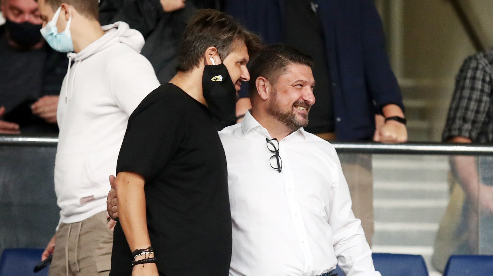 Ο νέος υφυπουργός Άμυνας παρακολούθησε την νίκη της Ένωσης, όμως στις φωτογραφίες που κυκλοφόρησαν φαίνεται να έχει πετάξει τη μάσκα του και να μιλάει με τον τραγουδιστή Πάνο Κιάμο.