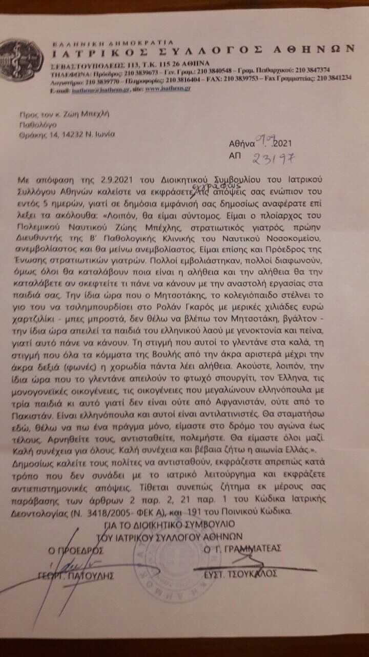 «Δημοσίως καλείτε του πολίτες να αντισταθούν, εκφράζεστε απρεπώς κατά τρόπο που δεν συνάδει με το ιατρικό λειτούργημα και εκφράζετε αντιεπιστημονικές απόψεις. Τίθεται ζήτημα εκ μέρους σας παράβασης των άρθρων 2 παρ 2. 21 παρ 1 του Κώδικα Ιατρικής Δεοντολογίας (Ν. 3418/2005 ΦΕΚ Α), και 191 του Ποινικού Κώδικα».