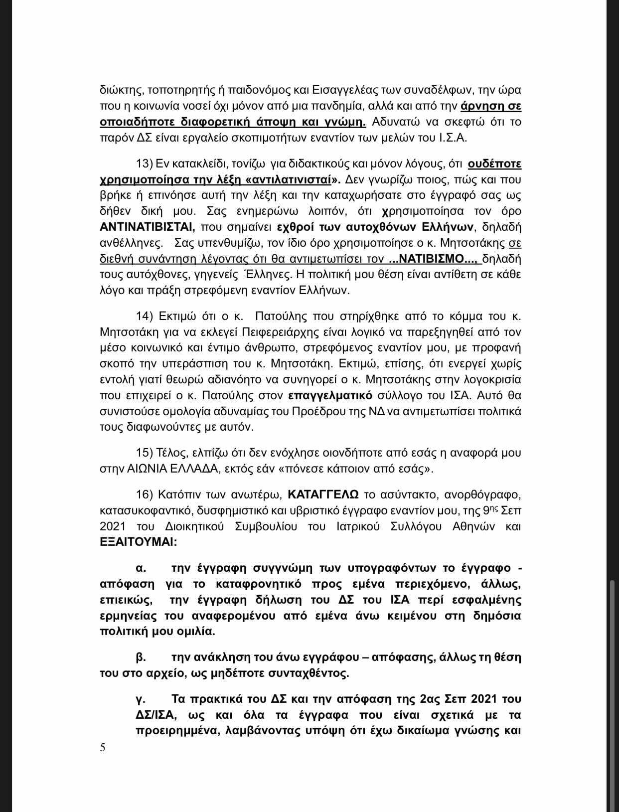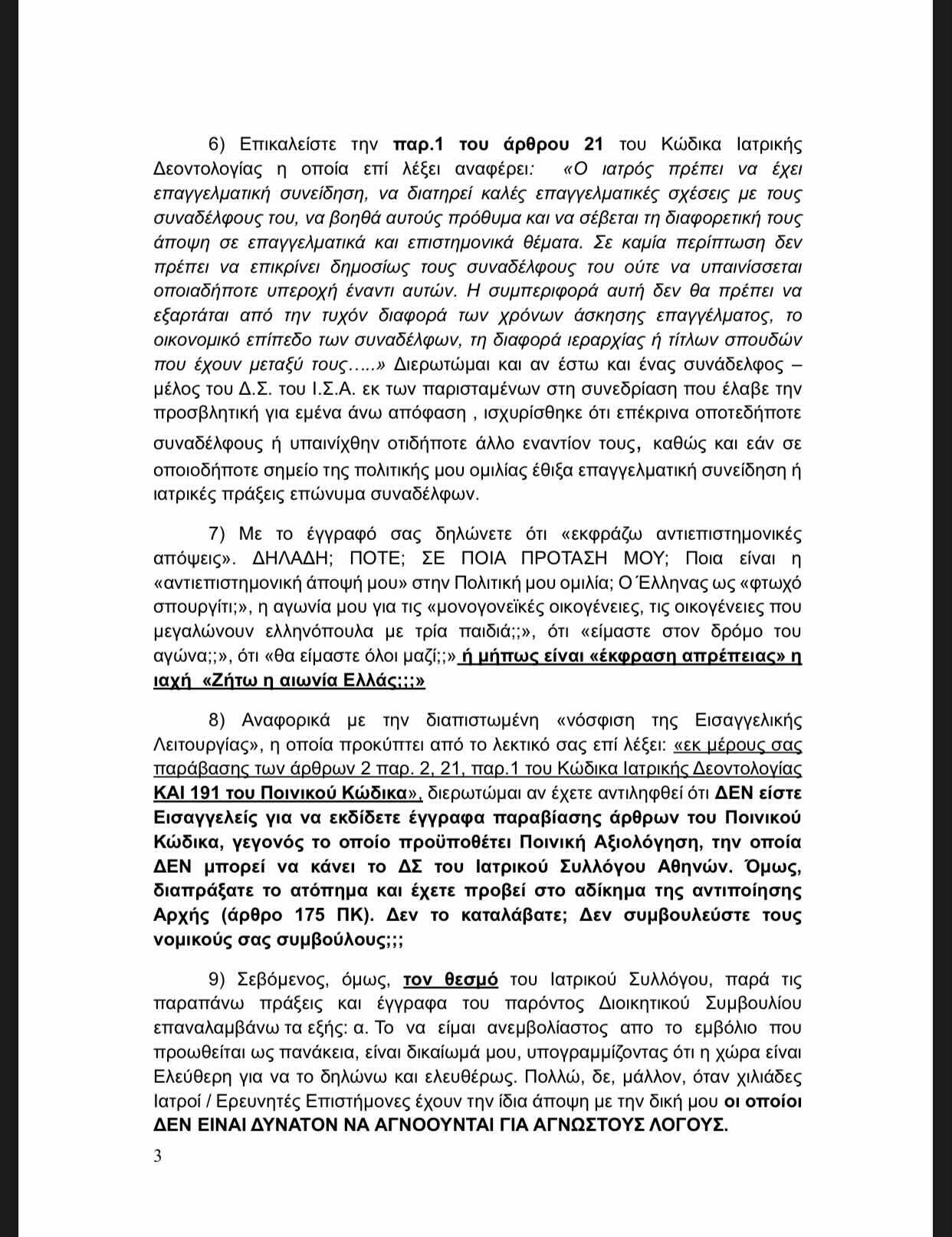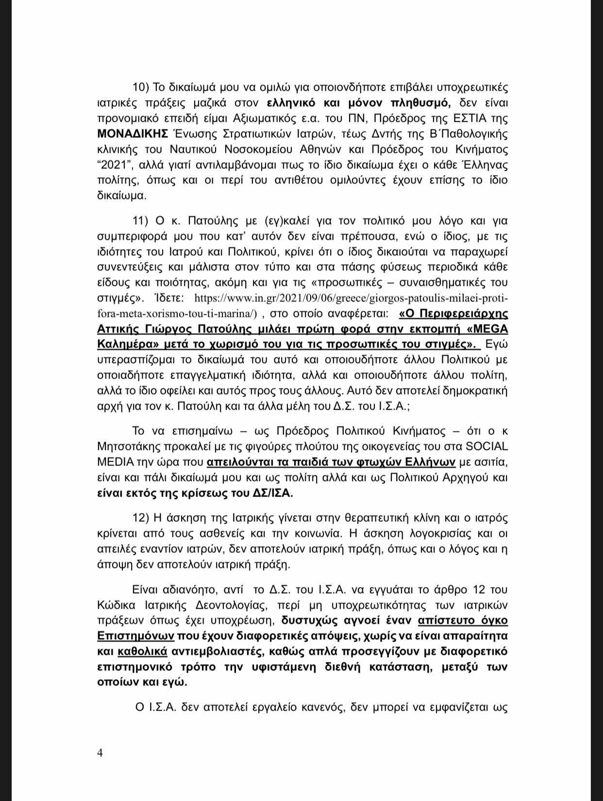 «Είμαι ανεμβολίαστος και θα μείνω ανεμβολίαστος», είχε πει ο πλοίαρχος και μάλλον αυτό δεν άρεσε ενώ κάνοντας και μια επιπλέον νύξη σε τηλεοπτική εκπομπή αναφέρει πως τον εγκαλούν ως ιατρικός σύλλογος ενώ εξέφραζε πολιτικό λόγο καθώς ο πλοίαρχος είναι πρόεδρος του «Κινήματος 21».