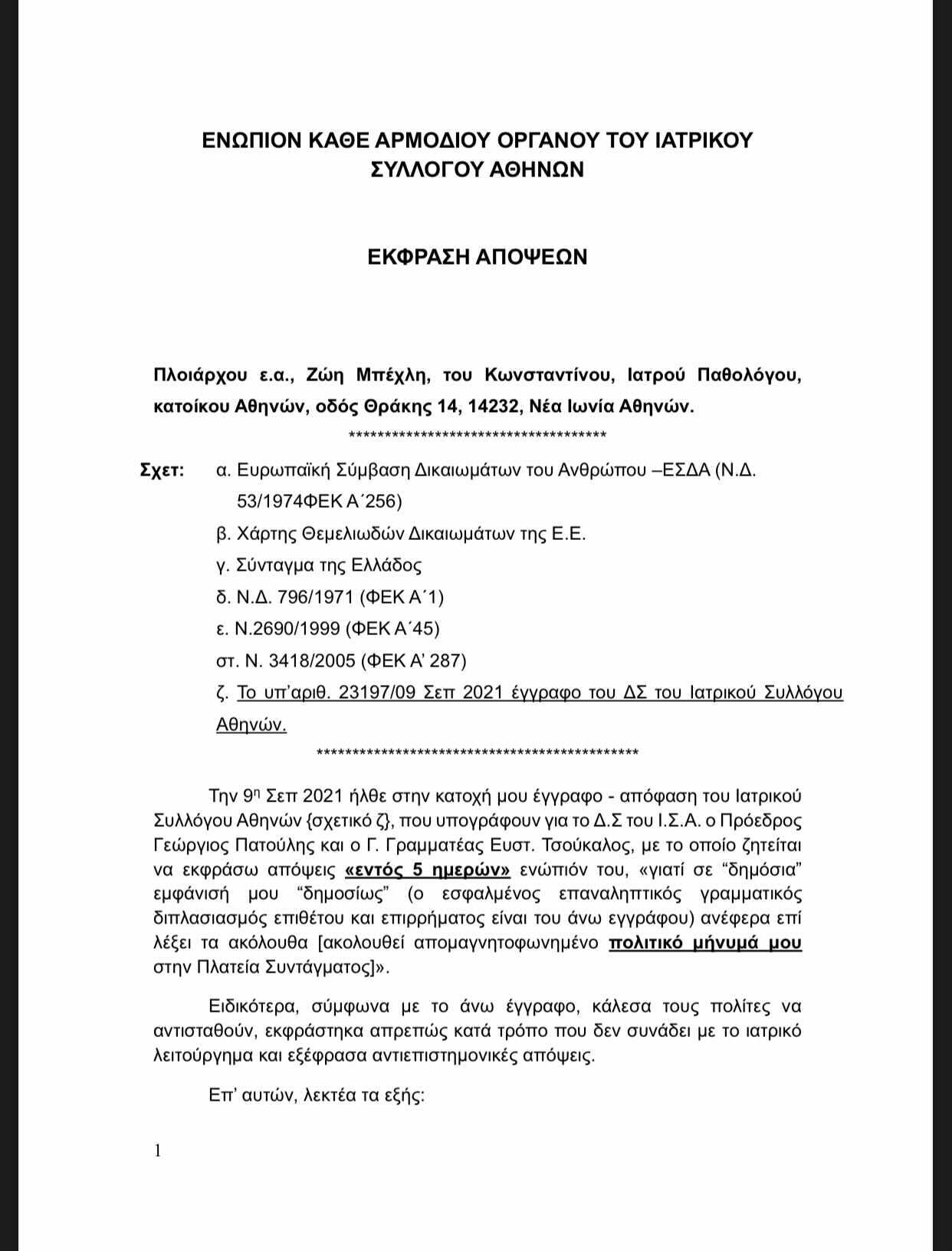 Η «χειμαρρώδης» ομιλία του Πλοιάρχου του Πολεμικού Ναυτικού, στρατιωτικού γιατρού και πρώην διευθυντής της Β’ Παθολογικής Κλινικής του Ναυτικού Νοσοκομείου, Ζώης Μπέχλης, κατά τη διάρκεια της διαδήλωσης κατά του υποχρεωτικού εμβολισμού, σε συγκέντρωση στην Αθήνα έφερε και τα… αντίποινα από τον ΙΣΑ (Ιατρικός Σύλλογος Αθηνών) καθώς τον εγκαλούν σε απολογία για το ζήτημα των εμβολίων.