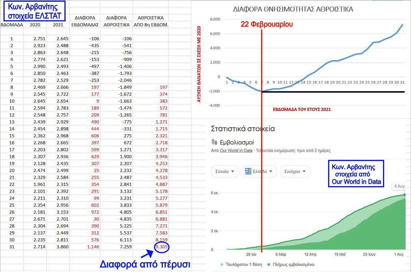 Μια αύξηση που σύμφωνα με τον Κ.Αρβανίτη δεν οφείλεται στον Covid-19, αντιθέτως όπως δείχνει με διαγράμματα φέρεται να συνδέεται χρονικά με την εκκίνηση του εμβολιαστικού προγράμματος.