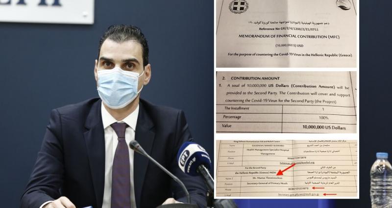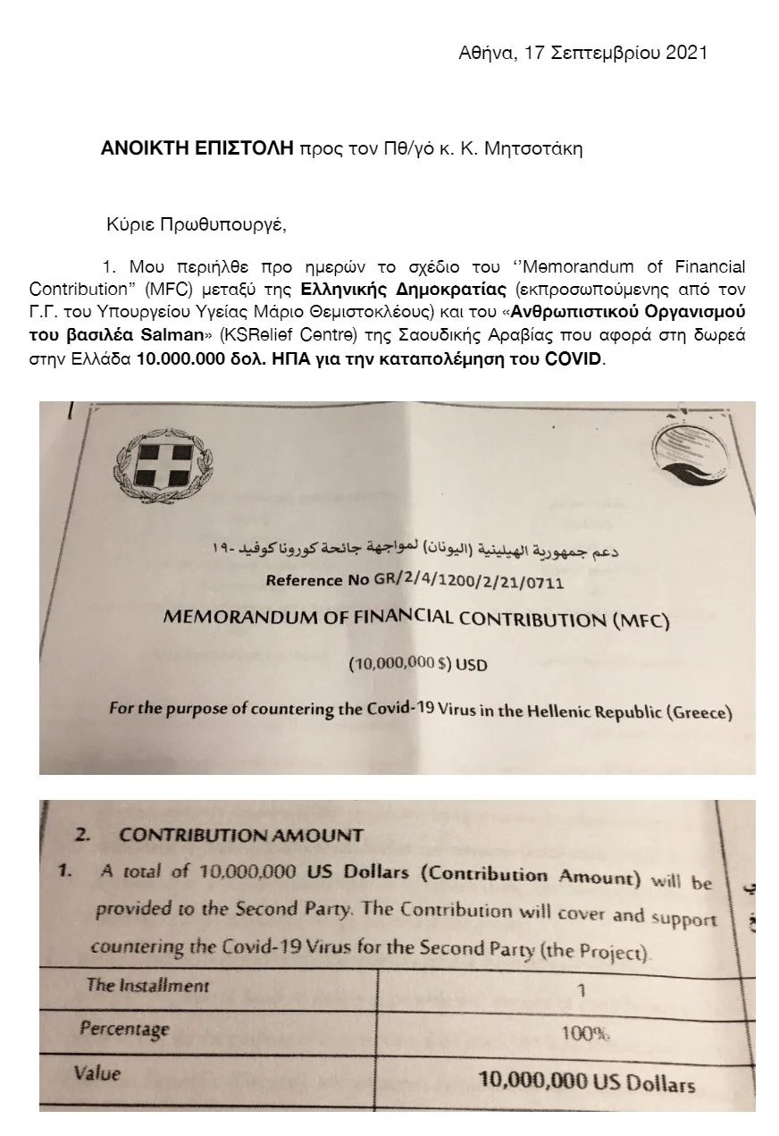 1. Μου περιήλθε προ ημερών το σχέδιο του «Memorandum of Financial Contribution» (MFC) μεταξύ της Ελληνικής Δημοκρατίας (εκπροσωπούμενης από τον γ.γ. του υπουργείου Υγείας Μάριο Θεμιστοκλέους) και του «Ανθρωπιστικού Οργανισμού του βασιλέα Salman» (KSRelief Centre) της Σαουδικής Αραβίας που αφορά τη δωρεά στην Ελλάδα 10.000.000 δολ. ΗΠΑ για την καταπολέμηση του COVID.