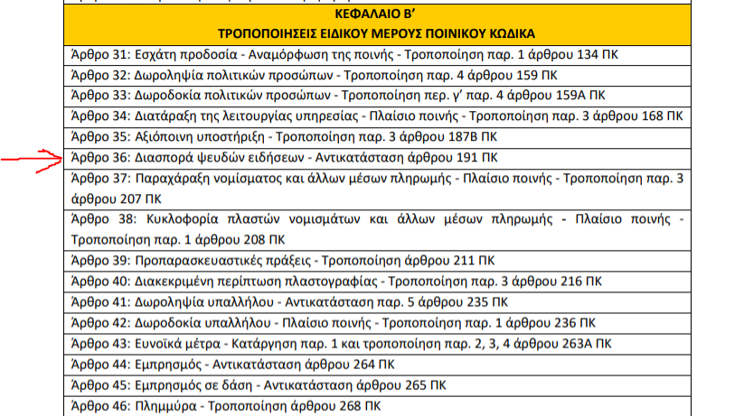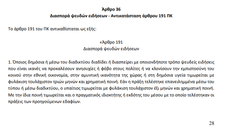 Όποιος δημόσια ή μέσω του διαδικτύου διαδίδει ή διασπείρει με οποιονδήποτε τρόπο ψευδείς ειδήσεις που είναι ικανές να προκαλέσουν ανησυχίες ή φόβο στους πολίτες ή να κλονίσουν την εμπιστοσύνη του κοινού στην εθνική οικονομία, στην αμυντική ικανότητα της χώρας ή στη δημόσια υγεία τιμωρείται με φυλάκιση τουλάχιστον τριών μηνών και χρηματική ποινή. Εάν η πράξη τελέστηκε επανειλημμένα μέσω του Tύπου ή μέσω διαδικτύου, ο υπαίτιος τιμωρείται με φυλάκιση τουλάχιστον έξι μηνών και χρηματική ποινή.
