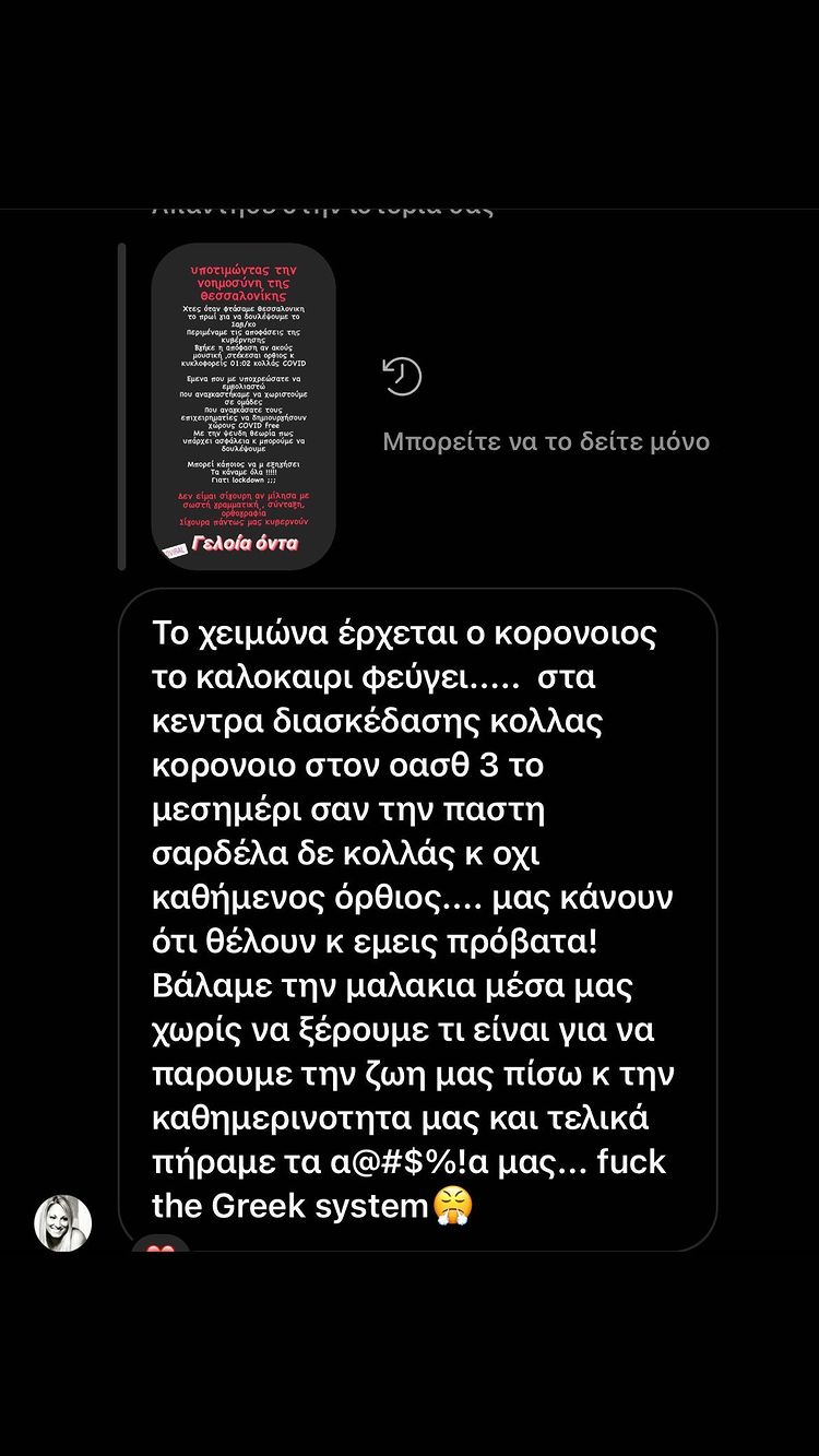 Στο τελευταίο story της, η Λελέ Γκόφα ανήρτησε τη φωτογραφία του πρωθυπουργού Κυριάκου Μητσοτάκη με τον γιο του, Κωνσταντίνο Μητσοτάκη από την έξοδό τους στον κινηματογράφο. «Ενώ η συμπρωτεύουσα αναμένει σε lockdown, συγγνώμη mini lockdown, ο πρωθυπουργός μας αναμένει την προβολή του James Bond» έγραψε χαρακτηριστικά.
