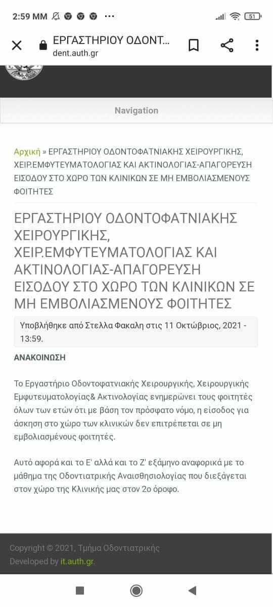 Όπως αναφέρεται σε e-mail που εστάλη στους φοιτητές σύμφωνα με τον πρόσφατο νόμο δεν επιτρέπεται η είσοδος στην κλινική σε όσους φοιτητές είναι ανεμβολίαστοι. Να σημειώσουμε πως η κυβέρνηση έκανε υποχρεωτικό τον εμβολιασμό κατά του κορωνοϊού στους υγειονομικούς, κάτι που ουσιαστικά ισχύει και για τους φοιτητές που σπουδάζουν επαγγέλματα υγειονομικού ενδιαφέροντος, γιατί αλλιώς δεν τους επιτρέπεται η είσοδος σε νοσοκομεία και κλινικές.