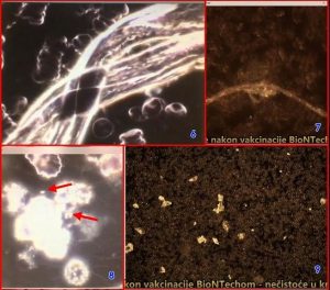 Στην φωτογραφία 8, διακρίνονται με το μικροσκόπιο, 6 μήνες μετά το εμβόλιο, μεταλλικά αντικείμενα μέσα στο αίμα τα οποία «χορεύουν», ενώ γύρω απ’ αυτά φαίνεται ότι το αίμα είναι κατεστραμμένο. Δεν είναι ζωντανό, ή, αν υπάρχει τέτοιος όρος, είναι αίμα σε κώμα. Στην διπλανή φωτογραφία, στην 9, φαίνονται πολύ πιο ευκρινώς τα μεταλλικά σωματίδια που κινούνται μεταξύ των ερυθρών αιμοσφαιρίων. Μεταλλικά αντικείμενα ακανόνιστων σχμημάτων.