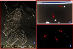 Στην φωτογραφία 4, βλέπουμε δύο περίεργα σωματίδια τα οποία κινούνται μέσα στο αίμα με τρόπο που μας φανερώνει ότι δεν είναι φυσιολογικά. Στην επομένη φωτογραφία (Φωτ. 5) βλέπουμε κάποια μικροαντικείμενα, που οι ειδικοί τ’ απεκάλεσαν «μικρά αταυτοποίητα μικροαντικείμενα». Είναι τα «ΑΤΙΑ» του αίματος. Αντικείμενα που δεν μπορούν να εξηγήσουν, ούτε τι είναι, ούτε από τι υλικό είναι φτιαγμένα.