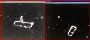 Στην παρακάτω φωτογραφία, βλέπουμε αριστερά (Φωτ. 1) έναν διπλό μεταλλικό φορέα ο οποίος έχει επάνω του κάποια υλικά του εμβολίου, αυτά που ομοιάζουν με σταγόνες, και τις μεταφέρει, χωρίς αυτές να διαλύονται ή ν’ αποκολλώνται από την επιφάνεια του φορέως, ενώ αυτός μετακινείται στο αίμα των ανθρώπων. Στην διπλανή φωτογραφία (Φωτ. 2) βλέπουμε πάλι κάποιον φορέα, μια τεχνητή δομή, από εμβόλιο της BioNTech/Pfizer, ο οποίος φαίνεται ολοκάθαρα ως τσιπάκι.