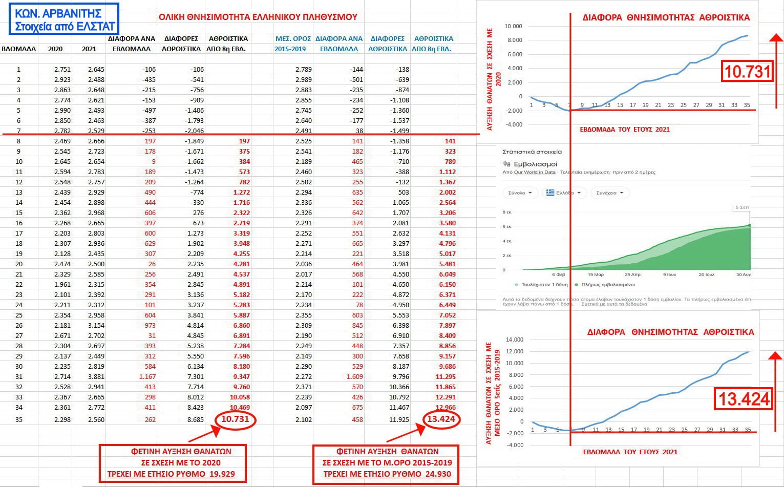 Μέχρι την 35η εβδομάδα (5 Σεπτεμβρίου) έχουμε μία υπερβάλλουσα θνησιμότητα, κατά 13.424 θανάτους!