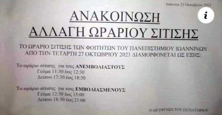 Συγκεκριμένα έγγραφο του Πανεπιστημίου Ιωαννίνων αναφέρει ότι το ωράριο σίτισης για τους ανεμβολίαστους είναι από τις 11:30 έως τις 12:30 (γεύμα) και από τις 17:30 έως τις 18:30 (δείπνο).