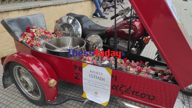Το φέρετρο το έστησαν σε μία παλιά μηχανή με καρότσα, την οποία μάλιστα γέμισαν με… πέταλα από λουλούδια, όπως γίνεται στις κηδείες. Μέσα υπάρχουν επίσης ποτήρια, μπουκάλια, σέικερ και κατσαρόλες.