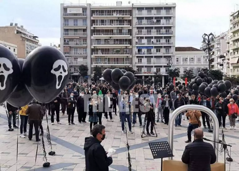 Συγκέντρωση διαμαρτυρίας στην Πάτρα με μαύρα μπαλόνια με νεκροκεφαλές