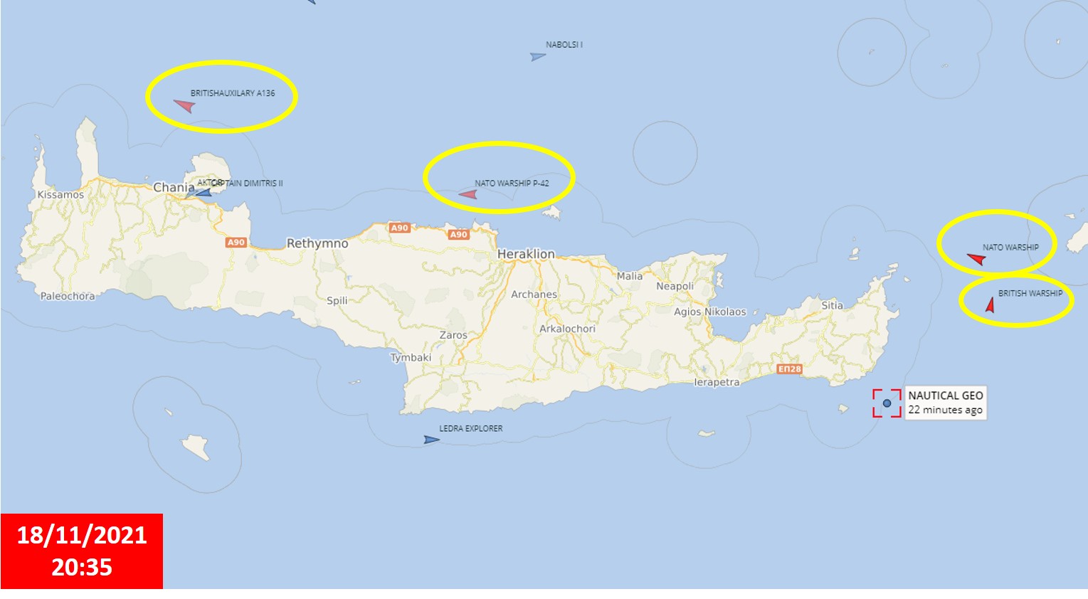 Το Nautical Geo ολοκλήρωσε τις εργασίες του στην κυπριακή ΑΟΖ και από το πρωί της Πέμπτης βρίσκεται αγκυροβολημένο στα 6 ναυτικά μίλια Ανατολικά της Κρήτης. Αναμένοντας NAVTEX των ελληνικών Αρχών, ώστε να συνεχίζει τις έρευνες.