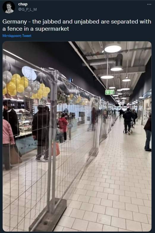 Την ίδια ώρα έχει γίνει viral τις τελευταίες ώρες μια εικόνα που δείχνει ένα σούπερ μάρκετ να είναι χωρισμένο με φράχτη. Συγκεκριμένα σε σούπερ μάρκετ γερμανικών συμφερόντων στη Ρουμανία έχει τοποθετηθεί συρματόπλεγμα για να ξεχωρίζουν οι εμβολιασμένοι με τους ανεμβολίαστους.