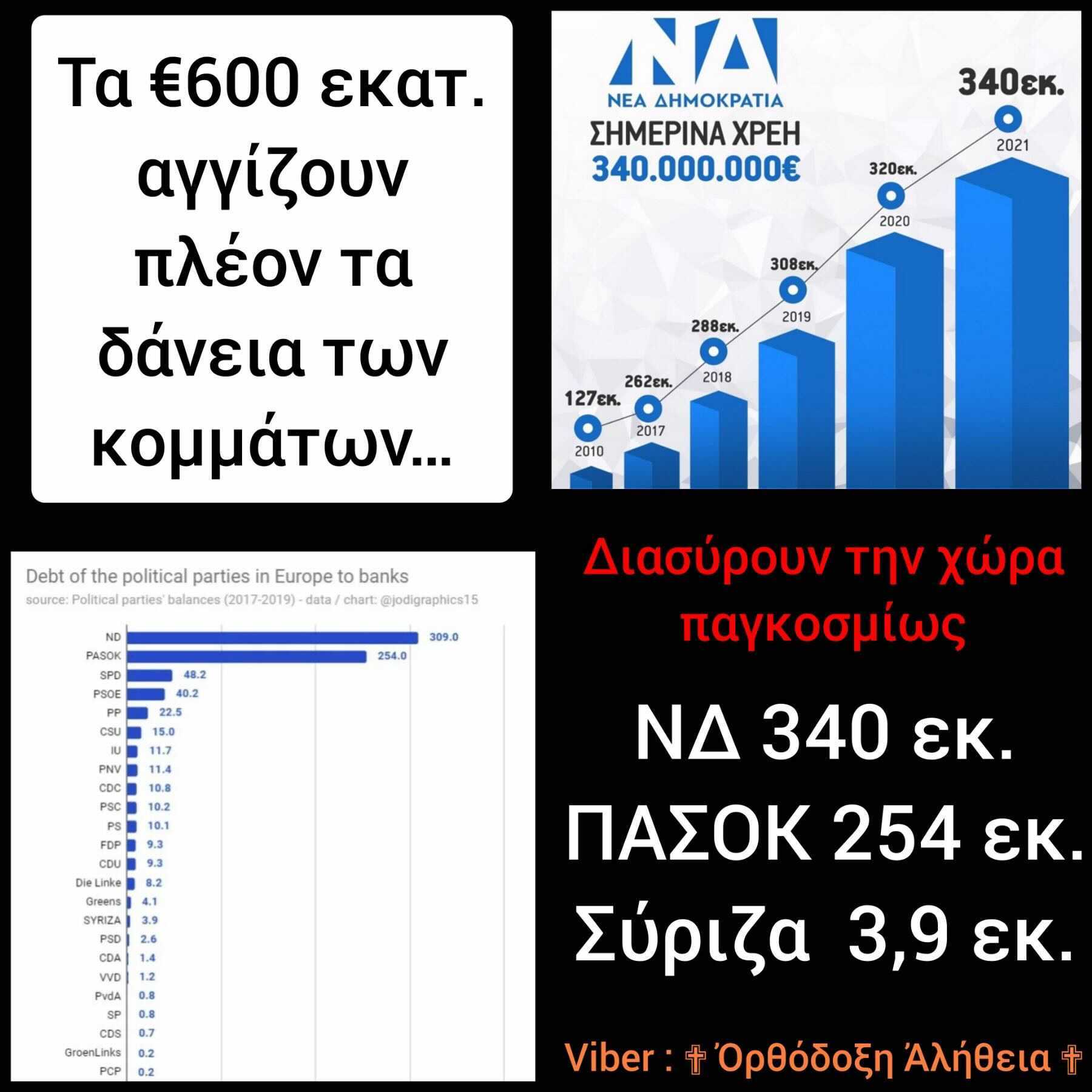 Μια θλιβερή πρωτιά έχει η Ελλάδα, καθώς τα μεγάλα κόμματα της χρωστούν πάρα πολλά εκατομμύρια. Η Νέα Δημοκρατία έχει χρέη 340 εκατομμυρίων, ενώ το ΠΑΣΟΚ χρωστά 254 εκατομμύρια. Φυσικά και ο ΣΥΡΙΖΑ έχει κάποια χρέη, τα οποία φτάνουν τα 3.9 εκατ. ευρώ.