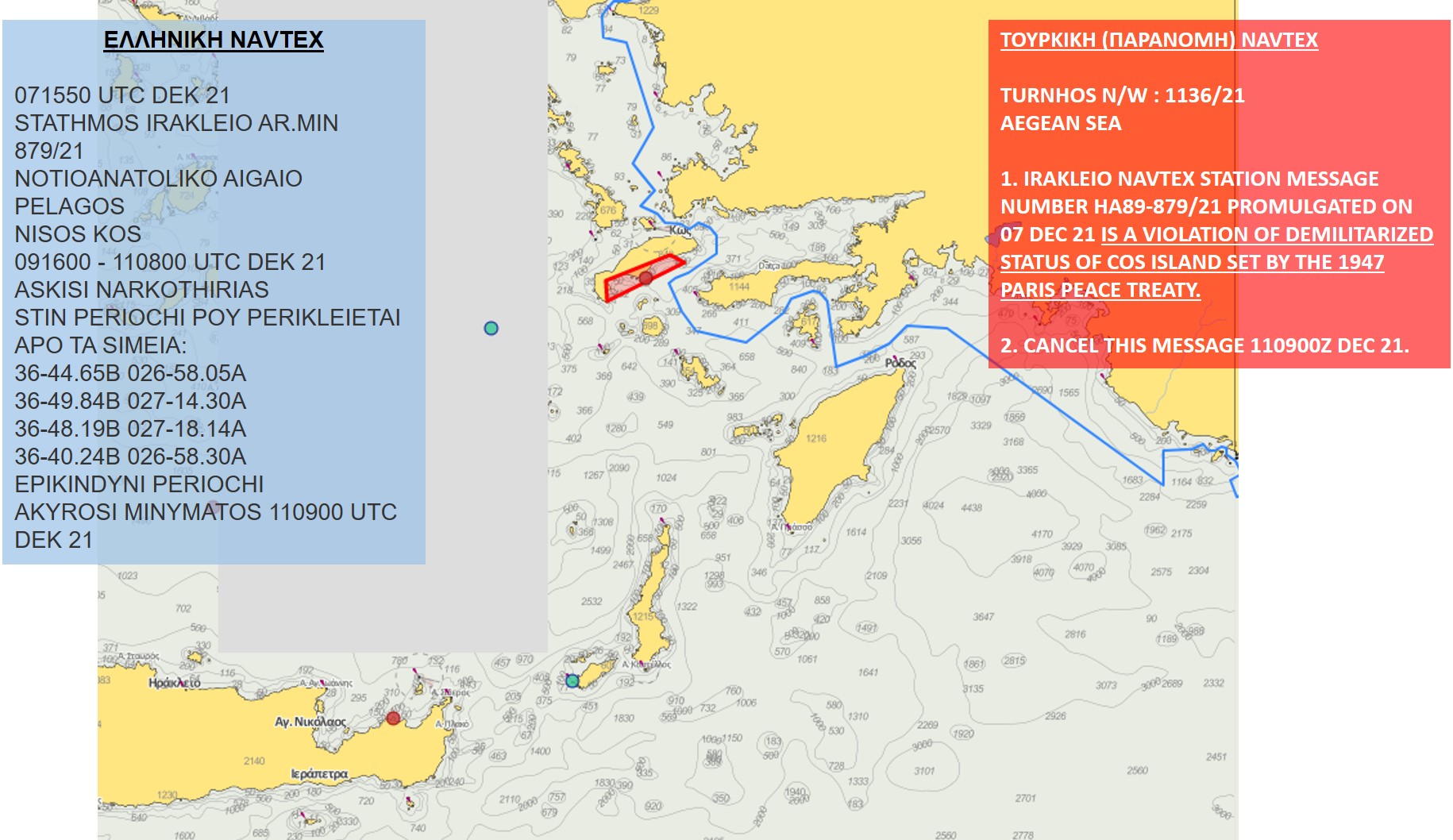 Η Τουρκία εξέδωσε αντι-NAVTEX με την οποία αμφισβητεί το δικαίωμα μας να κάνουμε άσκηση μια ανάσα από τις ακτές στην Κω. Για ακόμη μια φορά η Άγκυρα «απαγορεύει» στην Ελλάδα να κάνει ασκήσεις σε ελληνικά στο Αιγαίο, με τους Τούρκους να ακολουθούν πιστά την τακτική που ακολουθούν εδώ και χρόνια.