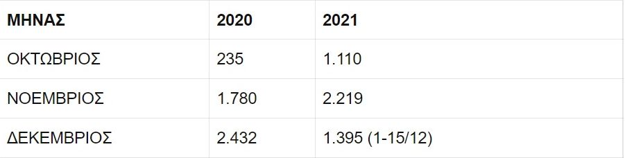 Μεγάλη είναι η διαφορά και στα στοιχεία του Νοεμβρίου του 2021, συγκριτικά με πέρυσι, ενώ ανησυχητικοί είναι οι αριθμοί του Δεκεμβρίου. Όπως βλέπετε και στο παρακάτω πίνακα, το Δεκέμβριο του 2020, καταγράφηκαν συνολικά 2.432 νεκροί, ενώ φέτος, μόλις το πρώτο δεκαπενθήμερο έχουν καταγραφεί 1.395, κάτι που προμηνύει ένα «μαύρο» φινάλε…