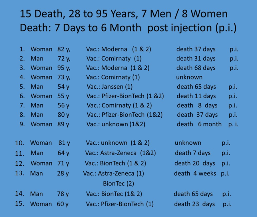Οι «υγειονομικοί κατά της υποχρεωτικότητας», δημοσίευσαν αναλυτικά το λόγο του S.Bhakdi, αλλά και το A.Burkhardt, οι οποίοι επί της ουσίας αναφέρονται στα ευρήματα της πρόσφατης έρευνας του Γερμανού ιατροδικαστή, μέσα από την οποία απέδειξαν ότι υπάρχουν θάνατοι από το εμβόλιο κατά του κορωνοϊού.