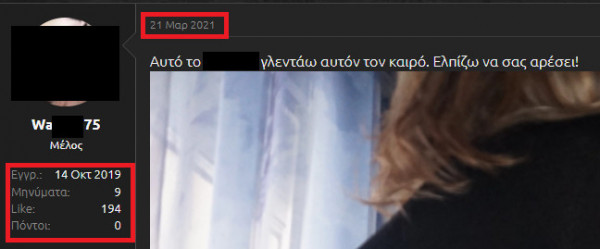Με αυτό τον κωδικό έχει προχωρήσει σε αναρτήσεις με γυμνές φωτογραφίες άλλων γυναικών με τις οποίες διατηρούσε μέχρι και πρόσφατα ερωτική σχέση. Μάλιστα σε αρκετές από αυτές «κομπάζει» για την επιτυχία να έχει δεσμό μαζί τους, ενώ όταν άλλοι χρήστες του ζητούν κι άλλες φωτογραφίες της ερωτικής συντρόφου του ή πληροφορίες για την ηλικία της κλπ, αυτός τους τροφοδοτεί με νέο υλικό και σχετικά δεδομένα. Κι όλα αυτά βεβαίως μέχρι και προ μερικών μηνών.