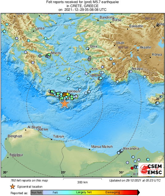 (Ανανέωση 7:33) Νέα ισχυρή σεισμική δόνηση μεγέθους 5,7 βαθμών της κλίμακας Ρίχτερ σημειώθηκε το πρωί της Τετάρτης στις 07:07, ανοιχτά της Κρήτης.