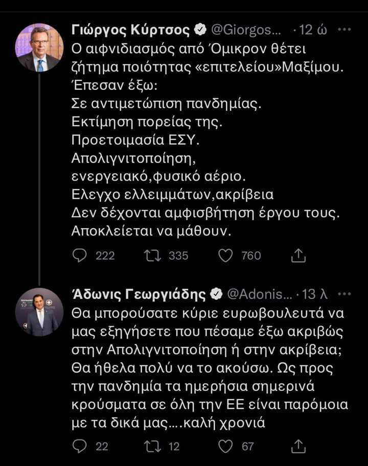 Συγκεκριμένα ο ευρωβουλευτής της ΝΔ, Γιώργος Κύρτσος, έκανε μια επικριτική ανάρτηση στο Twitter και ο υπουργός Ανάπτυξης, Άδωνις Γεωργιάδης, του απάντησε και προσπάθησε να τον διαψεύσει.