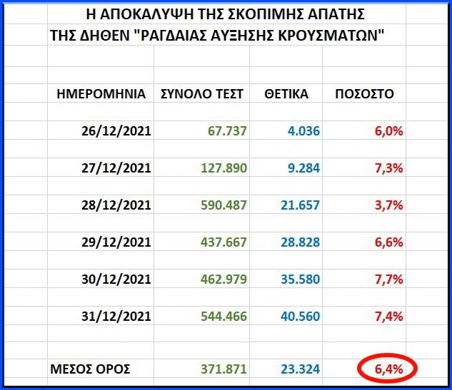 2) Εξαίρεση αποτελεί η Τρίτη 28 Δεκεμβρίου, όπου ανέβασαν τρομακτικά τον αριθμό των τεστ, για να ανέβουν στα ύψη τα “κρούσματα” και να τρομοκρατήσουν δείχνοντας ένα πρωτοφανές νούμερο.