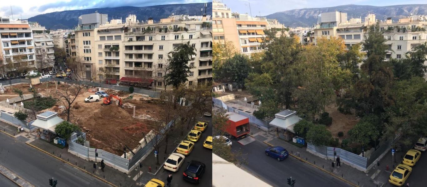 Σοκάρουν οι δύο φωτογραφίες από την πλατεία Κολωνακίου που είδαν το φως της δημοσιότητας, καθώς όλα τα δέντρα που υπήρχαν έχουν ξεριζωθεί!