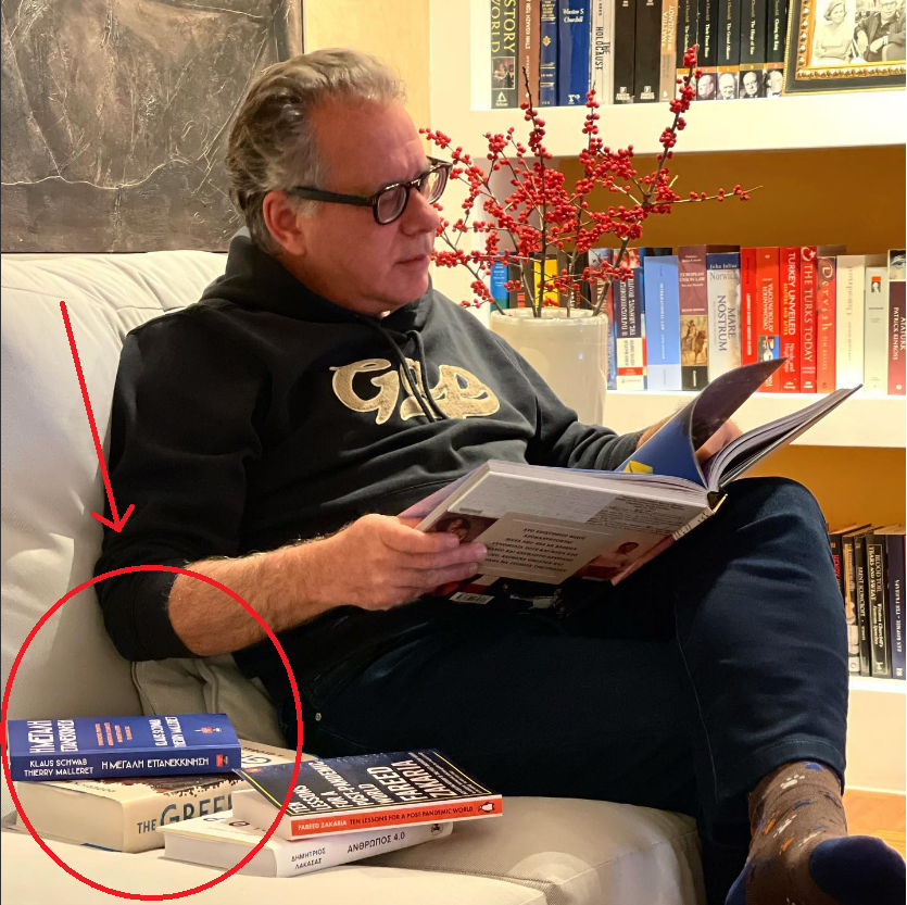 Ο βουλευτής της Νέας Δημοκρατίας, Γιώργος Κουμουτσάκος, δημοσίευσε προ λίγων ημερών μια φωτογραφία από τα δώρα των Χριστουγέννων, ανάμεσα σε αυτά ήταν και το βιβλίο που έγραψε ο Κλάους Σβαμπ, μαζί με τον Τιερί Μαλερέτ και ουσιαστικά αποτελεί το εγχειρίδιο για το πως μπορούν οι κυβερνήσεις να εκμεταλλευτούν την πανδημία του κορωνοϊού για να επιβάλλουν το σχέδιο της «Μεγάλης Επανεκκίνησης».