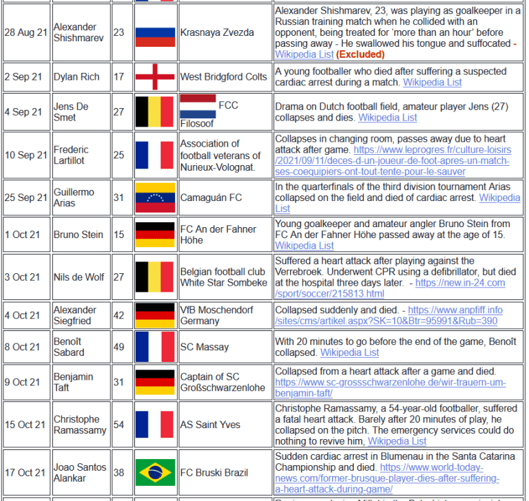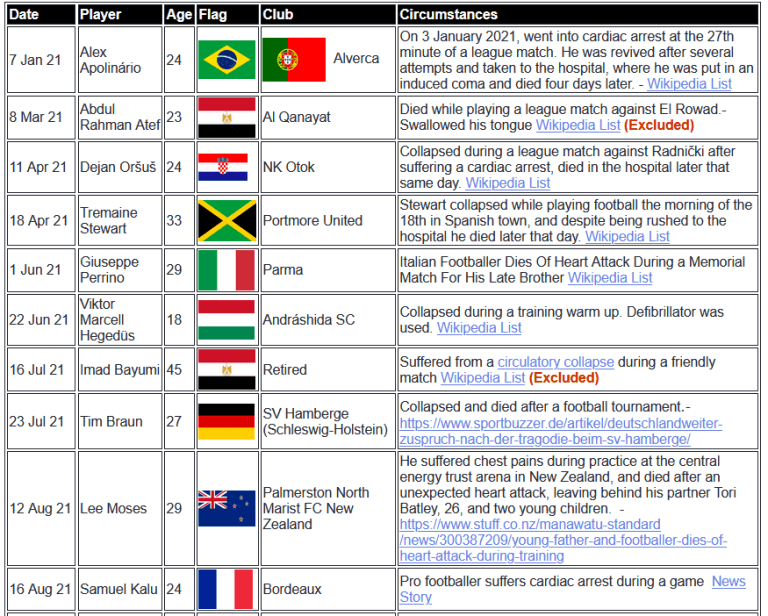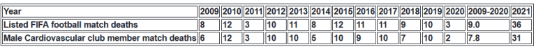 Συμπερασματικά μπορούμε να πούμε τα εξής: Τέσσερις φορές περισσότεροι επαγγελματίες ποδοσφαιριστές (31/7,8) πέθαναν από καρδιαγγειακά προβλήματα κατά τη διάρκεια αγώνων (αγώνων ή προπόνησης) από το 2009 έως το 2020. Υπήρξαν περισσότεροι 15 φορές περισσότεροι θάνατοι από καρδιακά και εγκεφαλικά το 2021 από ό,τι ήταν το 2020.