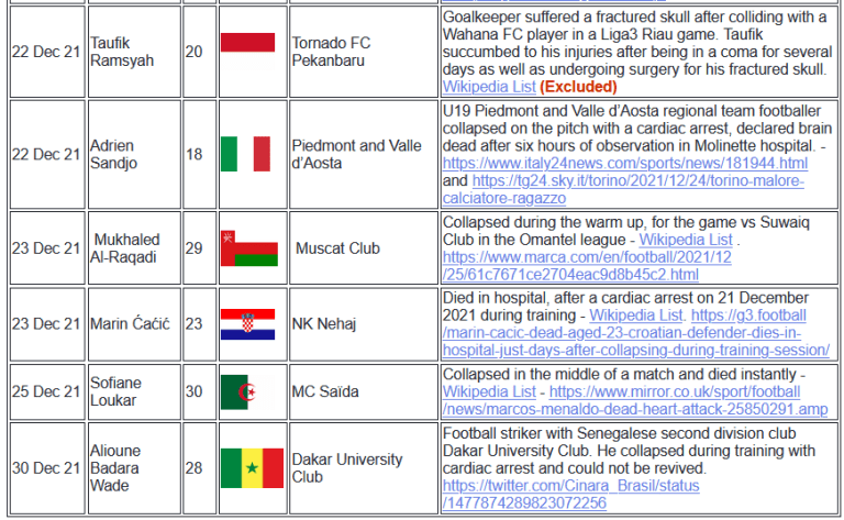 Να σημειωθεί επιπλέον ότι αυτή η μαύρη λίστα που παρουσιάζουμε εδώ δεν αφορά τους αθλητές γενικώς γιατί εκεί μιλάμε για τριψήφια νούμερα.. Επίσης αφορά μόνο τους ποδοσφαιριστές που έχασαν τελικά την ζωή τους χωρίς να συμπεριλαμβάνονται εκείνοι που στάθηκαν πιο τυχεροί(πχ προσφάτως ο Ουσμάν Κουλιμπαλί) και ανένηψαν.