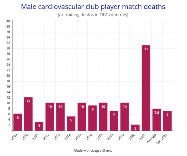 Μια έρευνα με βάση τα διαθέσιμα δεδομένα δείχνει ότι οι θάνατοι από καρδιαγγειακά προβλήματα σε επαγγελματικούς αγώνες ποδοσφαίρου/ποδοσφαίρου παγκοσμίως το 2021 – την χρονιά δηλαδή που ξεκίνησε η εμβολιαστική εκστρατεία- ήταν 300% υψηλότεροι από τον μέσο όρο των 12 ετών, με τον αριθμό των θανάτων που σημειώθηκαν μόνο τον Δεκέμβριο του 2021 να ισοδυναμεί με τον μέσο όρο 2009-2020.