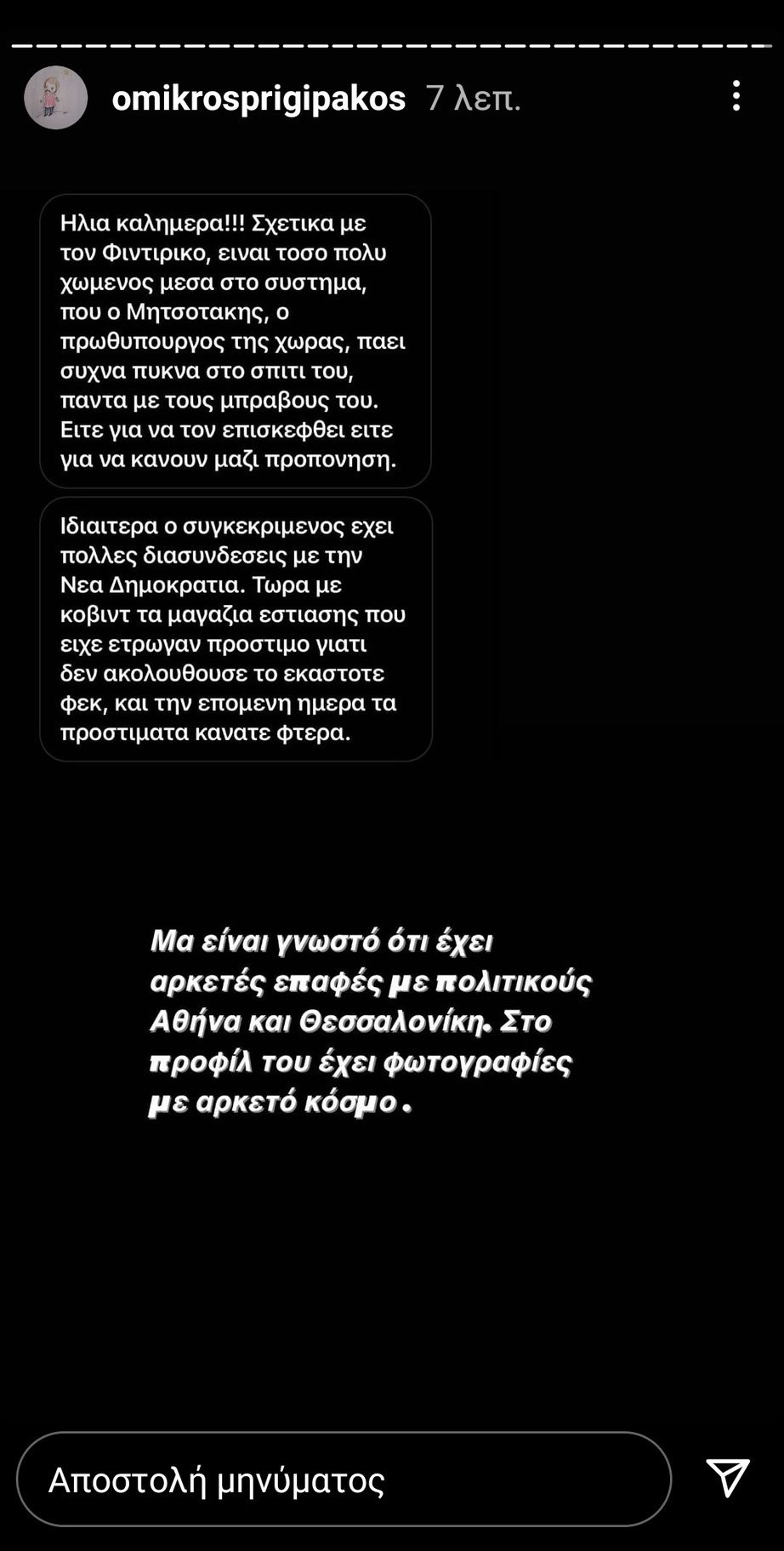 Μετά από αυτά, το ότι o πρωθυπουργός Κ.Μητσοτάκης είναι ακόλουθος follower του influencer Αλέξανδρου Κοψιάλη που επιχείρησε να «ξεπλύνει» τους αδελφούς Λεβέντη με αναρτήσεις του μέσα από το Instagram (ακόλουθοι 1.200.000 άτομα, παρακαλούμε, μέχρι εκείνη την στιγμή!) και είναι ανάμεσα στα ελάχιστα πρόσωπα που ακολουθεί στα μέσα κοινωνικής δικτύωσης, είναι πραγματικά μια μικρή λεπτομέρεια σε αυτή την δυσώδη ιστορία πολιτικής και κοινωνικής παρακμής…