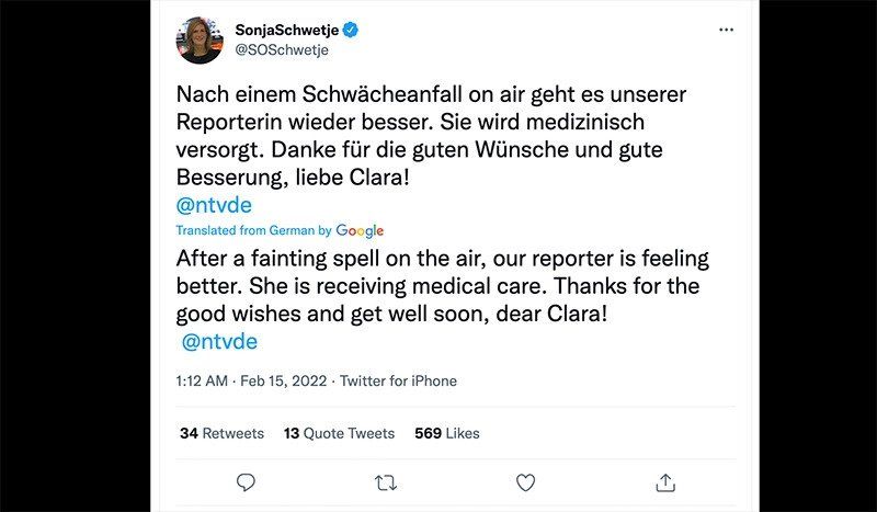 Η αρχισυντάκτρια του N-TV , Sonja Schwetje, επιβεβαίωσε ότι η Pfeffer είχε υποστεί «λιποθυμία» και είπε ότι τα πάει καλύτερα, αφού έλαβε ιατρική φροντίδα.