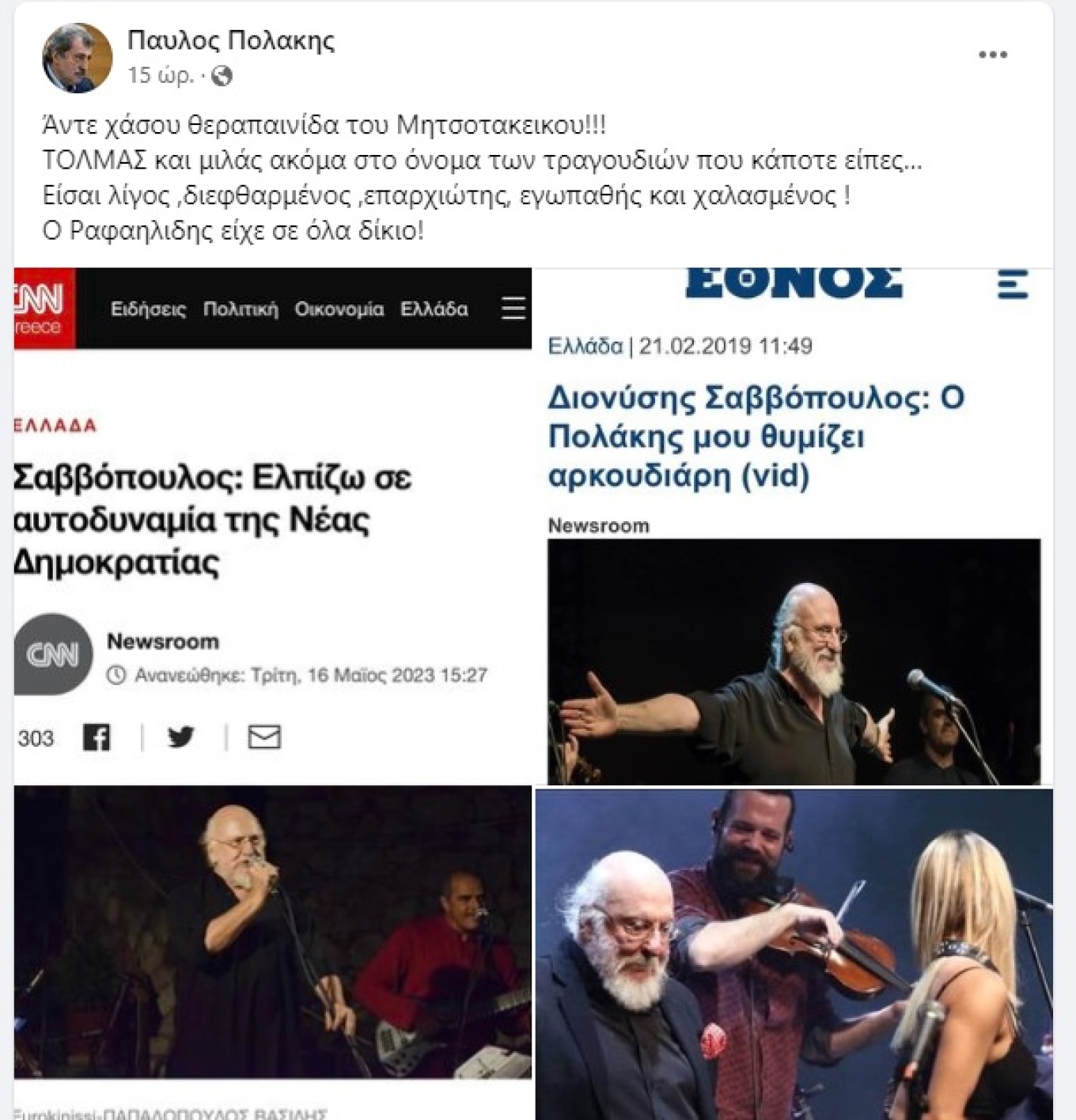 «Άντε χάσου θεραπαινίδα του Μητσοτακεικου! ΤΟΛΜΑΣ και μιλάς ακόμα στο όνομα των τραγουδιών που κάποτε είπες… Είσαι λίγος ,διεφθαρμένος ,επαρχιώτης, εγωπαθής και χαλασμένος ! Ο Ραφαηλιδης είχε σε όλα δίκιο!» έγραψε χαρακτηριστικά ο Παύλος Πολάκης στην ανάρτησή του.