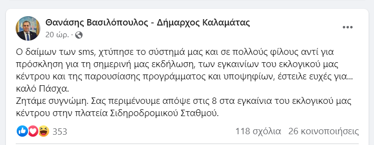 Ο ίδιος έσπευσε να εξηγήσει για το λάθος που έγινε: «O δαίμων των sms, χτύπησε το σύστημά μας και σε πολλούς φίλους αντί για πρόσκληση για τη σημερινή μας εκδήλωση, των εγκαινίων του εκλογικού μας κέντρου και της παρουσίασης προγράμματος και υποψηφίων, έστειλε ευχές για… καλό Πάσχα. Ζητάμε συγνώμη».